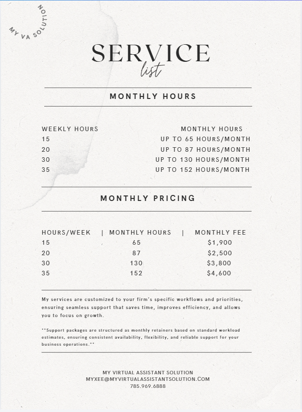 *My services are customized to your firm’s specific workflows and priorities, ensuring seamless support that saves time, improves efficiency, and allows you to focus on growth.